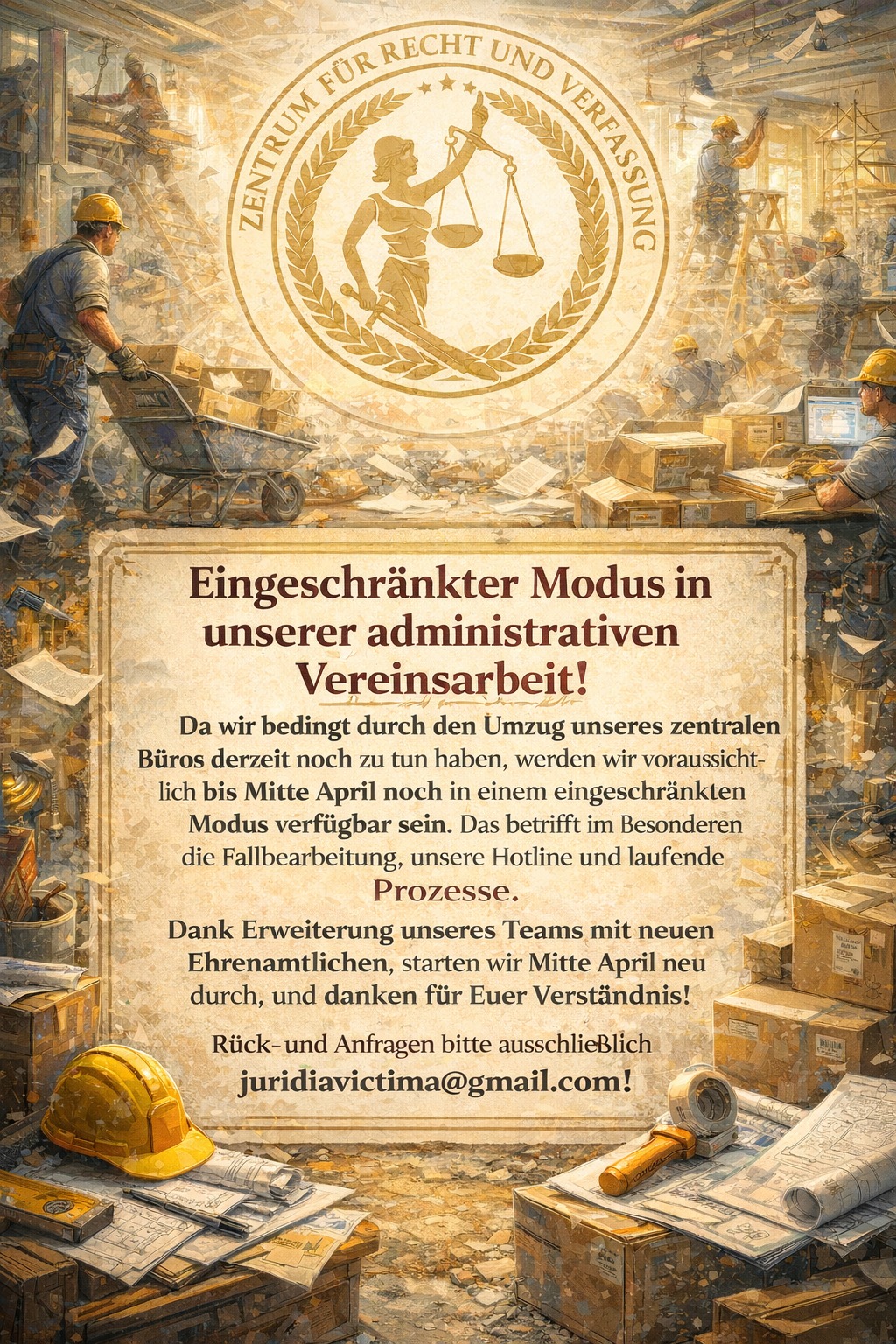 Da wir bedingt durch den Umzug unseres zentralen Büros derzeit noch zu tun haben, werden wir voraussichtlich bis Mitte April noch in einem eingeschränkten Modus verfügbar sein. Das betrifft im Besonderen die Fallbearbeitung, unsere Hotline und laufende Prozesse. Dank Erweiterung unseres Teams mit neuen Ehrenamtlichen, starten wir Mitte April neu durch, und danken für Euer Verständnis! Rück- und Anfragen bitte ausschließlich per Email an juridiavictima@gmail.com!